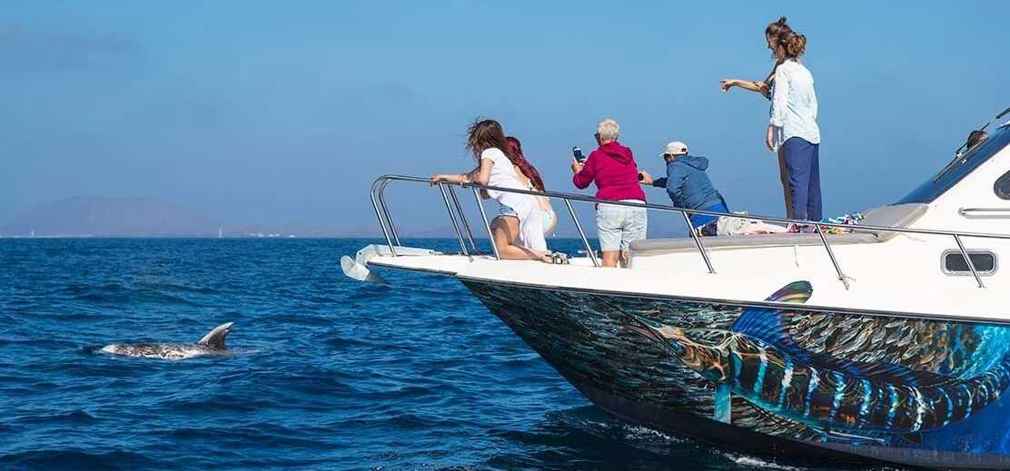 Live a unique experience in Fuerteventura with our Cetaceans Combo. This excursion designed for the whole family to enjoy begins at the Corralejo pier, from where we will sail to one of the best areas of the Canary Islands to observe all kinds of cetaceans and aquatic animals in their natural habitat between Fuerteventura, Lanzarote and the island of Lobos , since the oceanographic characteristics of the area allow you to enjoy the local ecosystem and the company of various types of cetaceans that live in these waters such as whales, dolphins, pilot whales and sea turtles among others.